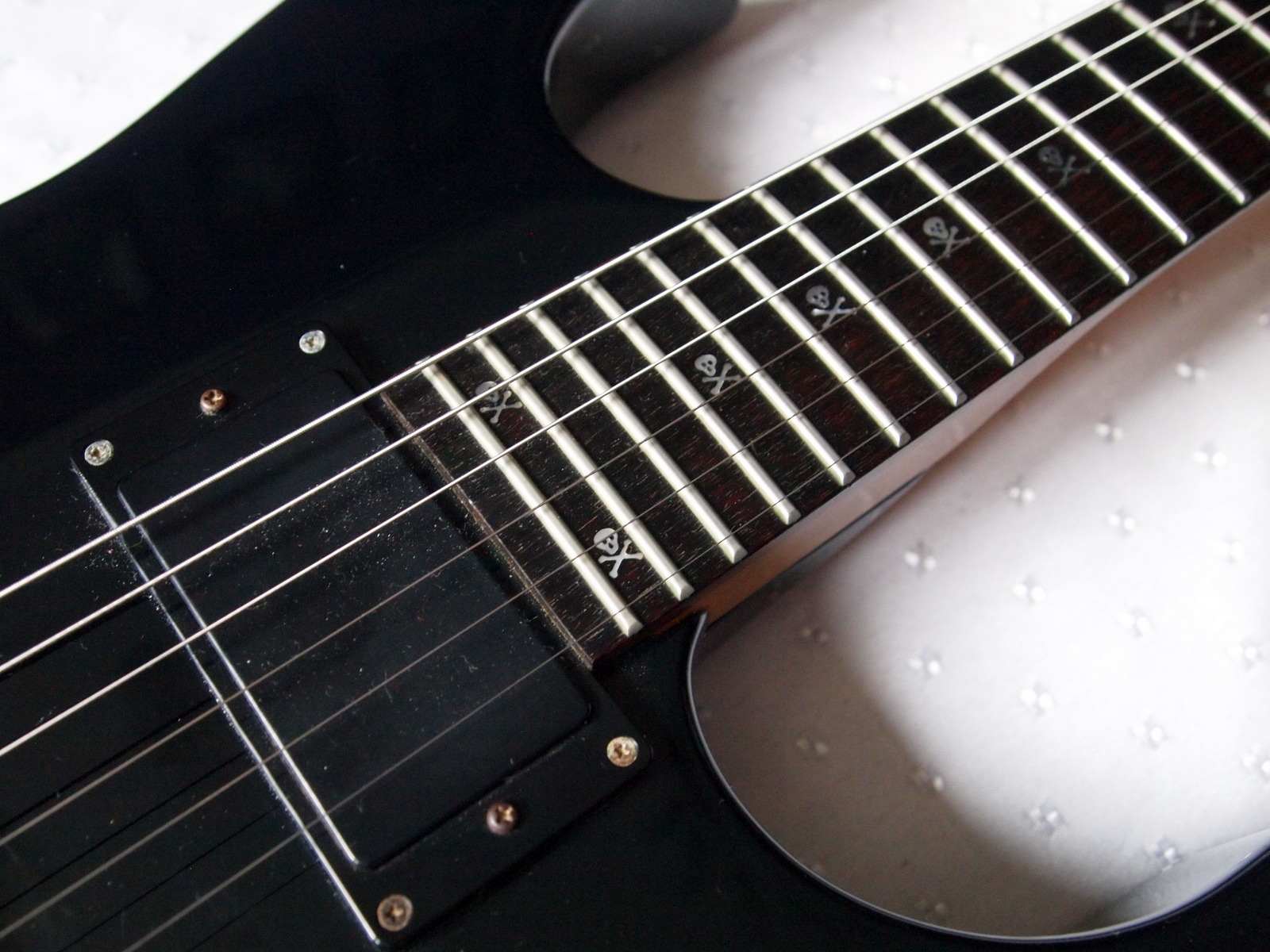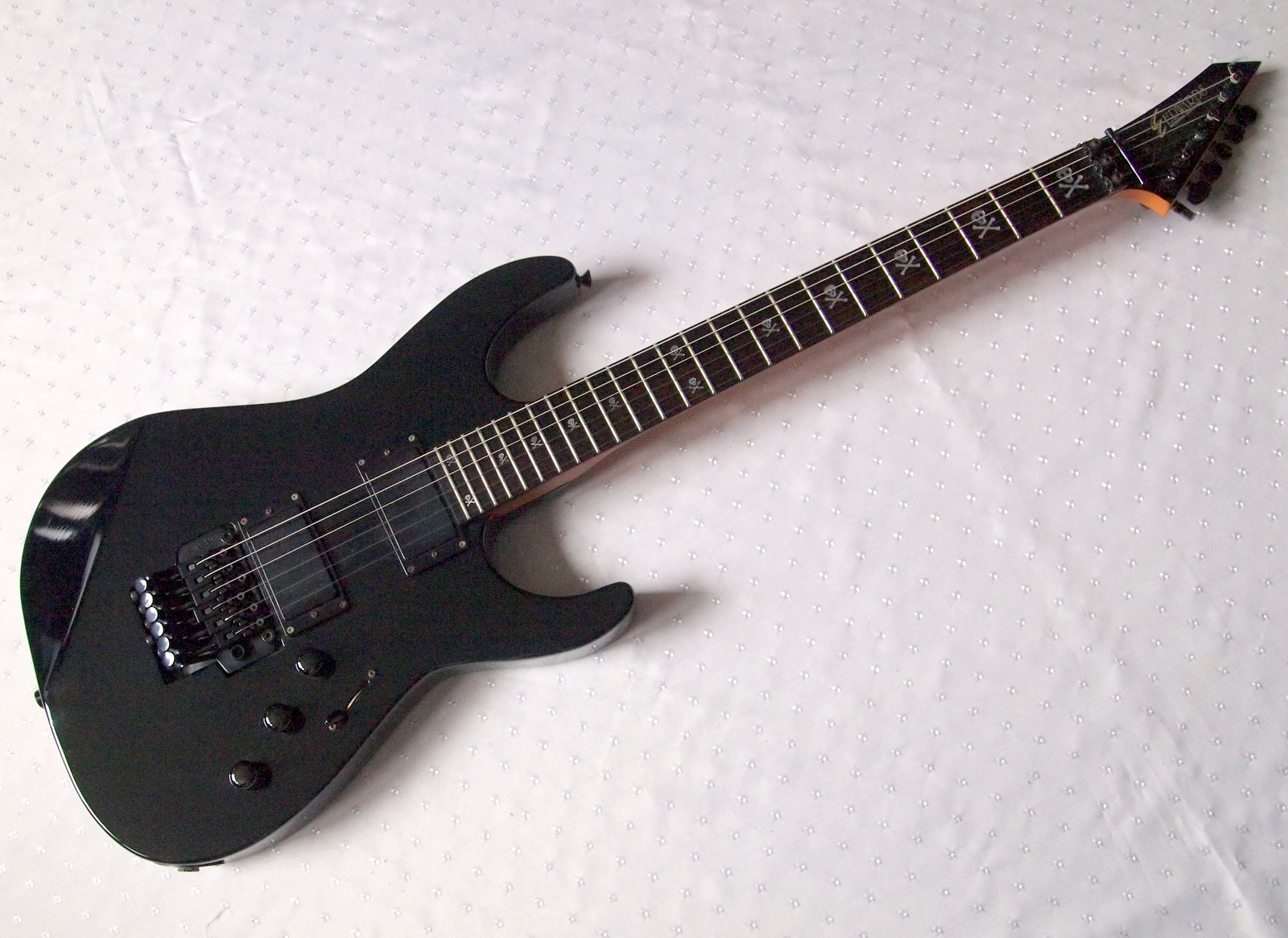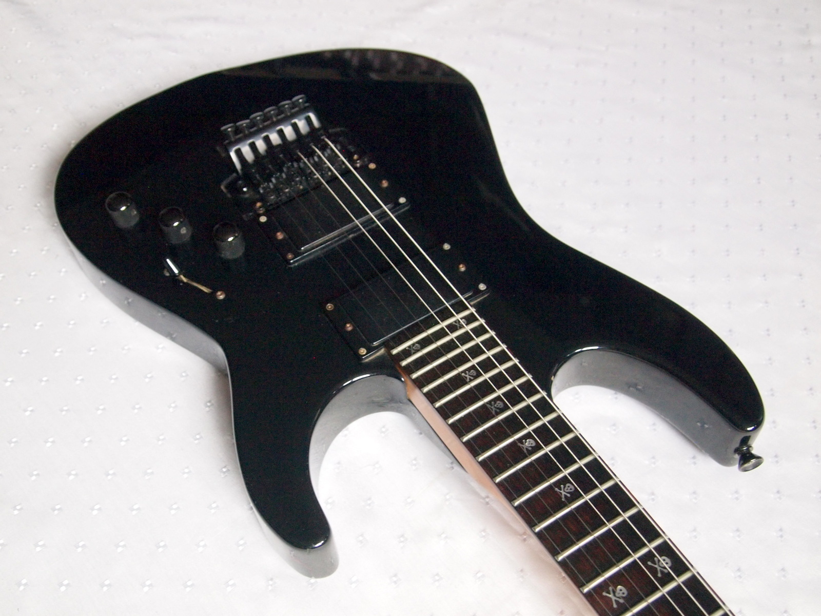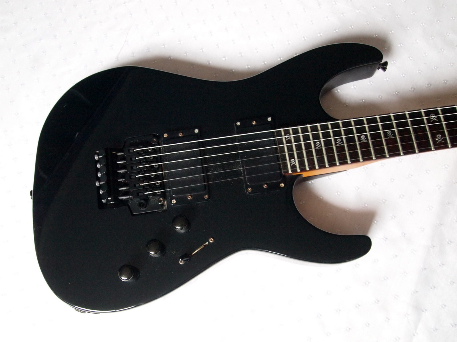 Модель имени великого и ужасного Kirk Hammett из поистине народной группы Metallica,произведенная на фабрике ESP. Радикально черный цвет, черепа на накладке, 24 лада, два хамбакера-стопроцентное соотношение звука и имиджа!!! Инструмент из самых первых годов выпуска, c, лого Produced by ESP на голове.