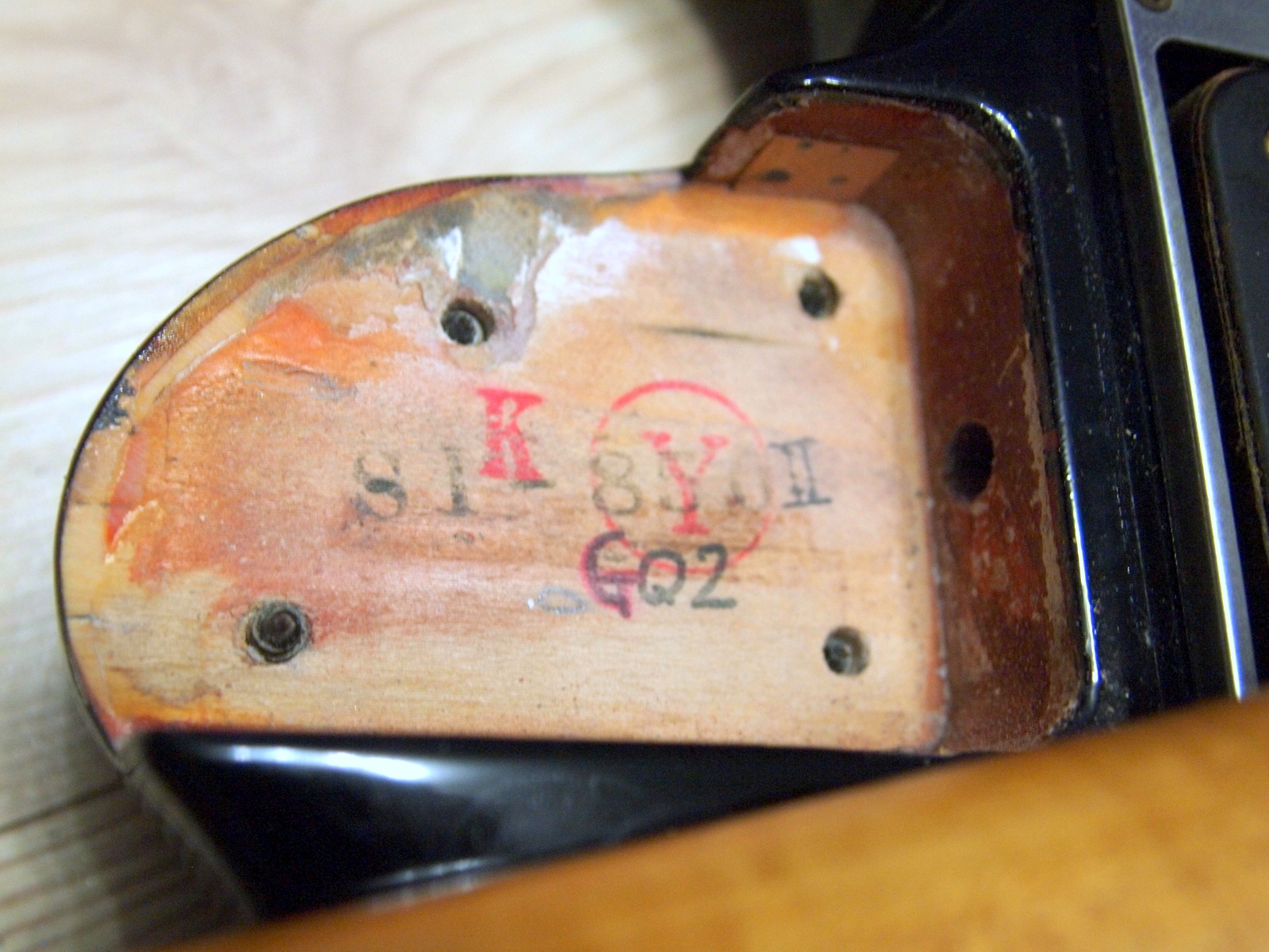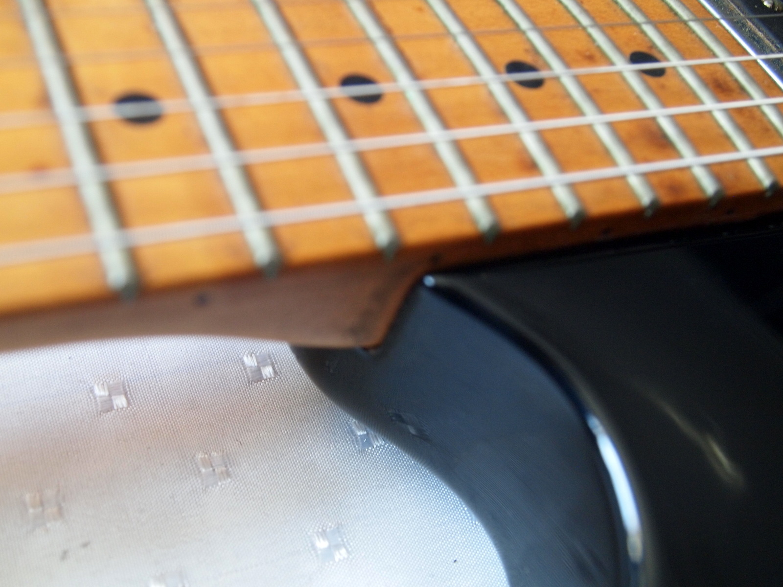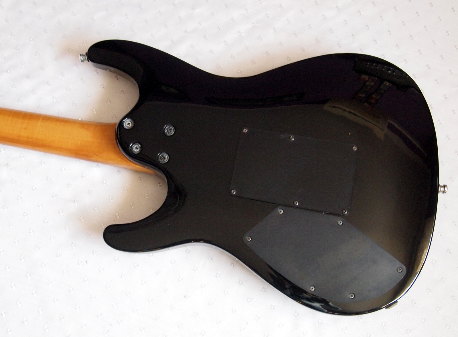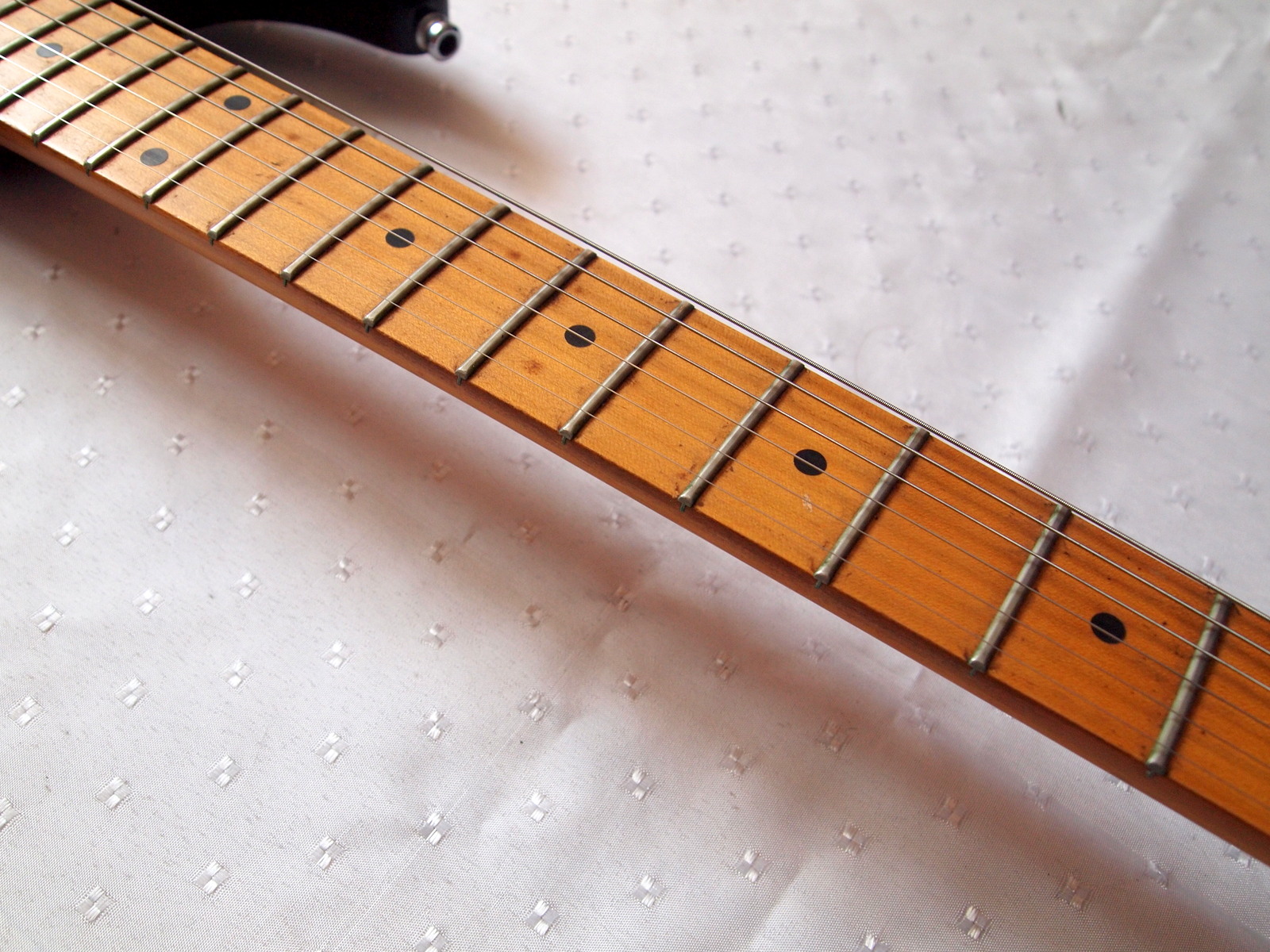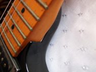 Гриф-клен, радиальный распил,прикрученный (bolt on) с железным подпятником,мензура: 25.5” (648 мм)