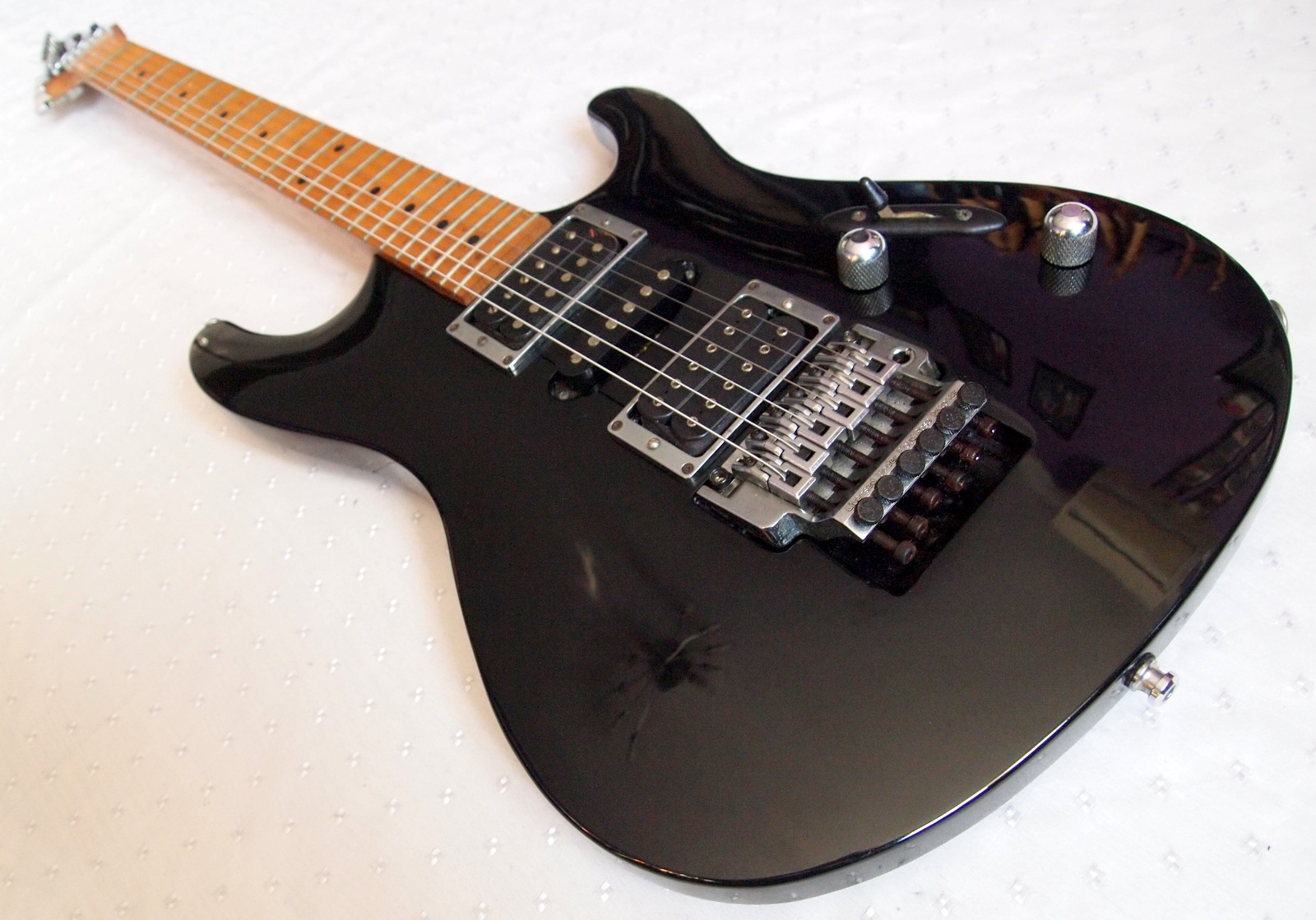 Тонкая эргономичная дека из ясеня и кленовый гриф с кленовой же накладкой дают на чистом звуке яркий стреляющий саунд как у хорошего Fender, ну а на перегрузе это отличная рок-гитара с читаемым и пробивным саундом, все скоростные арпеджио прямо отстреливают из под пальцев, риффы в духе Беттенкурта и Гилберта звучат ярко и стаккатно.