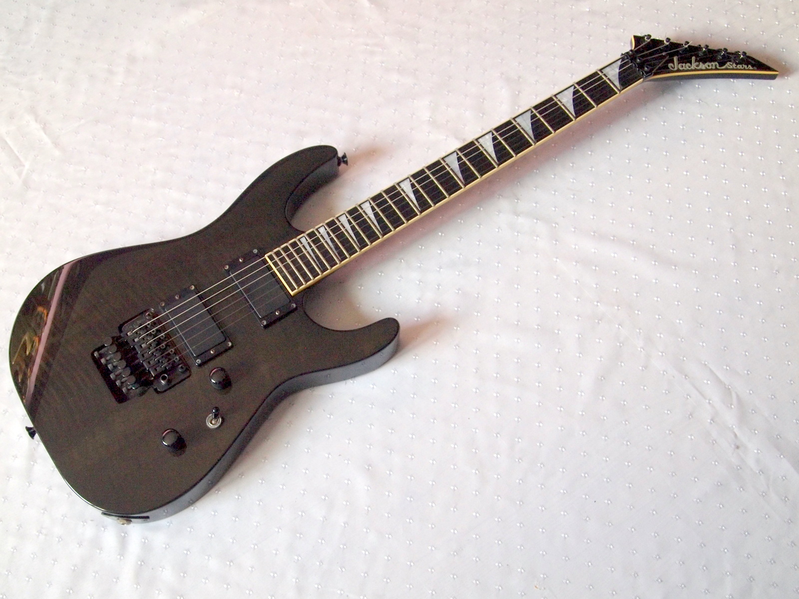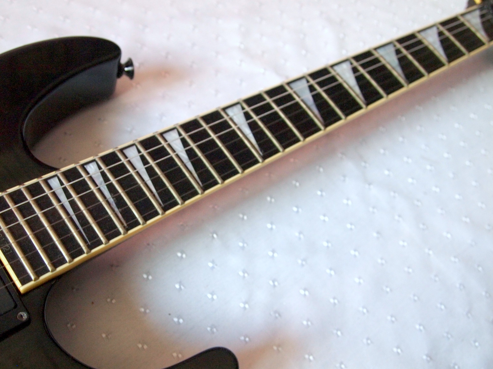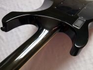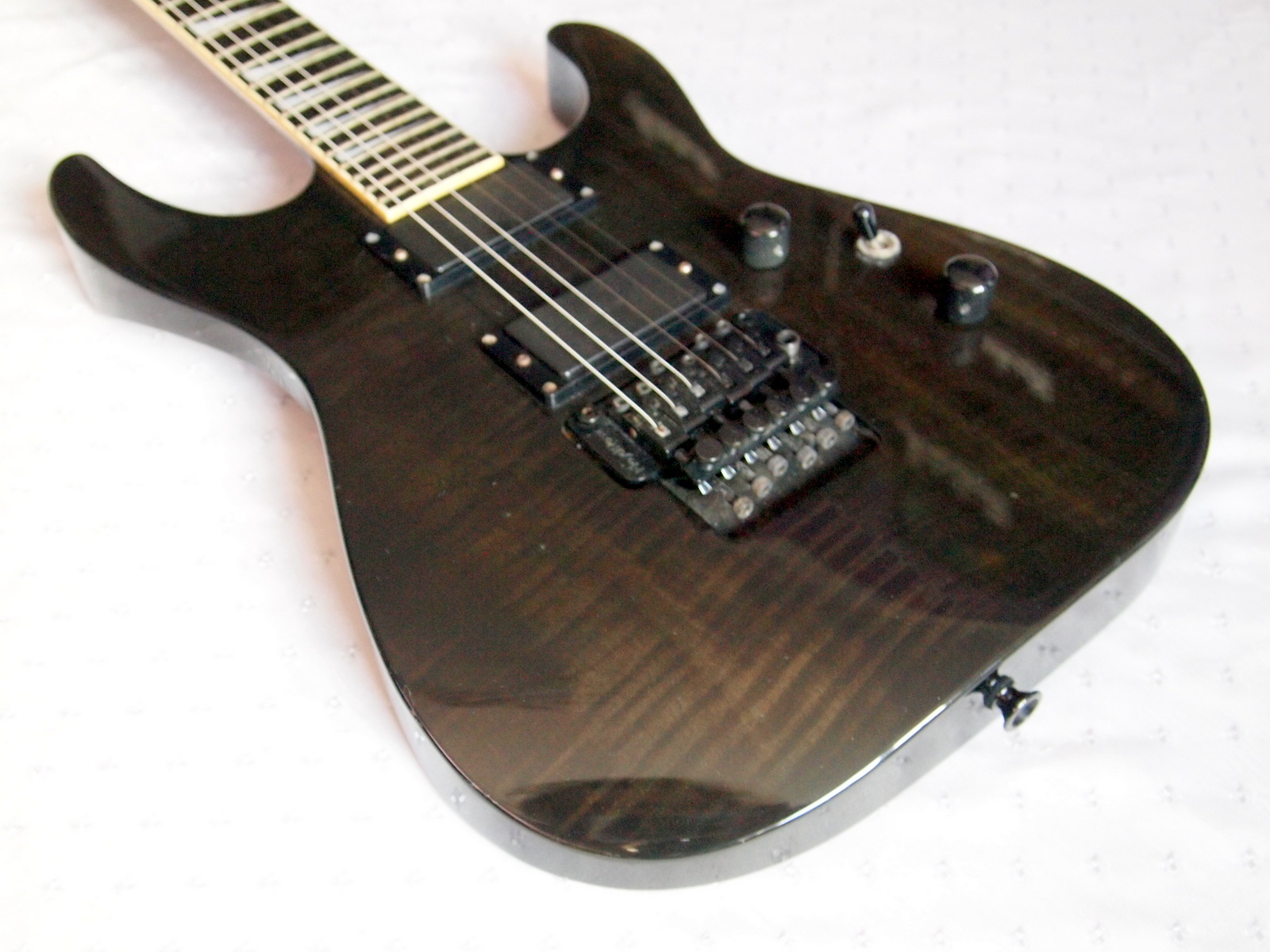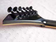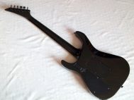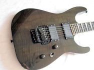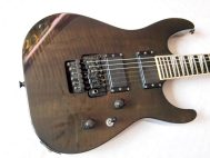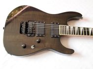 Очень красивый солоист из топовой серии нулевых годов 21 века, стоивший тогда по каталогу 183 000 Йен, что было равно почти 2000 USD. Сделан безо всяких компромиссов, кленовый гриф с накладкой из черного дерева идет сквозь ольховый корпус с кленовым топом, инструмент укомплектован звукоснимателями EMG и Floyd Rose Original, сам инструмент в цвете Trans Black и из под черного лака виден рисунок дерева.