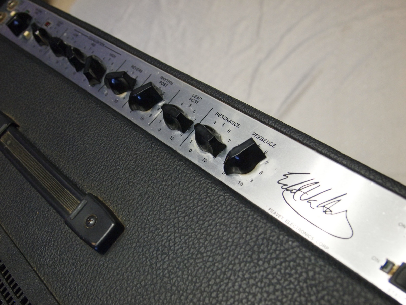 Это шестидесятиваттный, полностью ламповый, двухканальный аппарат, имеющий входы с низкой и высокой чувствительностью. Как он звучит? Это не передается ни какими словами. Советую послушать Van Halen. Входы при одновременном использовании становятся параллельными, что позволяет производить линкование нескольких усилителей. Режимы переключаются кнопкой Crunch On/Off. В первом случае канал выдает несколько рваную, агрессивную, не очень сильную перегрузку, которая прекрасно подходит для исполнения ритмических партий. Во втором случае канал работает в режиме чистого звука, при этом звучит очень прозрачно и плотно. При необходимости можно как к чистому звучанию канала, так и к перегруженному добавить яркости нажатием на кнопку Bright, которая производит ступенчатый подъем высоких частот. В каком бы режиме канал ни работал, его входная чувствительность изменяется регулятором Rhythm Pre Gain, а громкость канала изменяется регулятором Rhythm Post Gain. Громкость канала можно регулировать ручкой Lead Post. Существуют два способа переключения каналов: кнопкой на верхней панели аппарата и ножным переключателем. Частотная коррекция производится общими для двух каналов трехполосным эквалайзером и регулятором компенсации высоких частот Presence. Мастер-секция включает в себя регулятор уровня реверберации Reverb и регулятор Presence. На задней панели аппарата располагаются разъемы последовательного посыла/возврата и гнездо для подключения ножного переключателя каналов, посыла/возврата и эффекта реверберации. Специально разработанные двенадцатидюймовые динамики Sheffield позволяют получить большое звуковое давление.